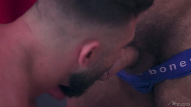 Dato Foland's big hairy dick is hard as a rock and testing the confines of his luxurious and revealing Skull & Bones briefs. Once Dato has unleashed his throbbing meat, the muscle hunk exchanges blowjobs with jockstrap-clad bodybuilder Alex Palmieri before bending the ripped Adonis over to rim, finger, and bareback his massive bubble butt. Alex whimpers and moans as the uncut couple continues fucking raw and switching positions until Dato is unloading himself all over Alex's pubes.