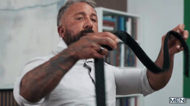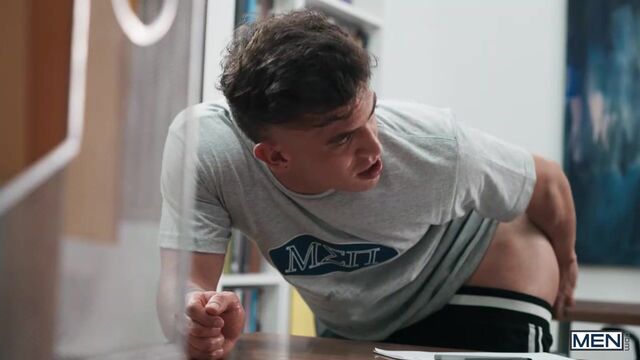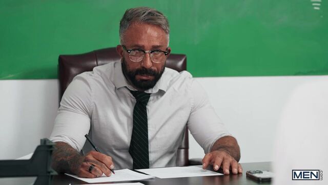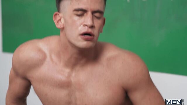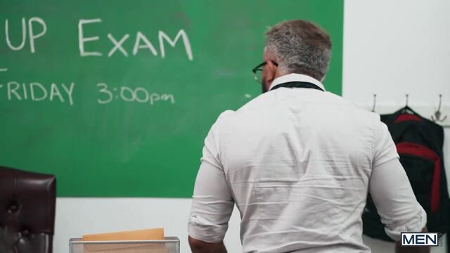 College guy Trevor Brooks has the classroom to himself when he arrives for the makeup exam, so why not have a little quality time? Professor Ken Rock catches him with his phone in one hand and his boner in the other, and quickly confiscates the electronic device. Troye Dean sits next to Trevor, and the guys flirt. Then Trevor pulls a dildo out of his bookbag to fuck himself, and Troye starts filming! Troye makes a hasty exit when the professor catches them, but Professor Rock takes control of the dildo, pumping it in the student's ass before Trevor sucks the silver fox. The tattooed teacher drills Trevor from behind, then sits in his chair as the bottom rides his dick. Trevor cums as his professor fucks him on the desk, then gets on his knees for a facial.