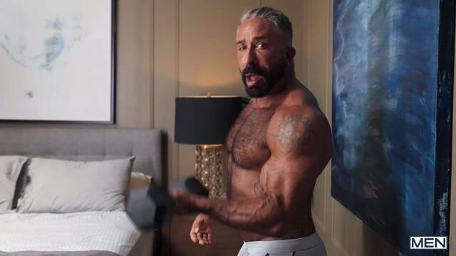 Adam Awbride wants to top for once, but his BF Sawyer Dixon never wants to bottom. After Sawyer cums quickly, Adam goes to shower but sees Sawyer's hot dad, Ken Rock, lifting weights and flashes him his dick! The distraction makes Ken drops the weight on his foot, and Adam kisses it better, then worships it as Ken jacks off. Adam sucks the daddy and fucks him missionary, finally getting to enjoy the feel of his cock in a tight hole! Adam gets the best of both worlds, riding Ken then getting dicked down in doggystyle. Then it's Adam's turn to top again as he fucks Ken till both guys cum!