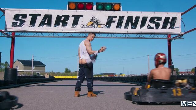 Drake Von and Dom King are ready to take each other on at the go-kart track. When they see hot employee Evan Peix bent over with his crack showing, they want to take him on, and Evan is happy to oblige. After Evan waves the checkered flag to end their race, the guys chase him down and hoist him up, carrying him right to the bedroom. Drake and Dom inform Evan he's bottoming today, so he eagerly gets to work sucking them before they take turns licking and fucking his hole. The guys spit-roast the eager bottom, and Evan's ready to take two cocks at once in a hot DP before both tops cum on his face!