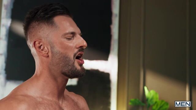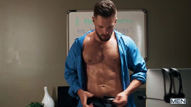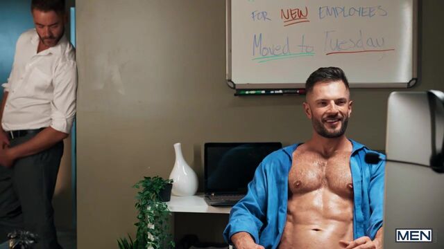 Holden Beau gets his new employee Zac Barrett settled in the office, and he realizes he'd like to see more of him, so he cranks the thermostat up to 90 and waits! It's not long before Zac starts sweating at his desk, and Holden sneaks back to peek at the hunk with his shirt unbuttoned. When Holden catches him with his pants unzipped, Zac realizes his boss turned up the heat and why, and he's not mad when Holden sucks his cock. Zac tongues his boss and fucks him, then Holden rides him on his new desk. Zac drills his new boss in doggystyle and on his back till both the sweaty guys cum!