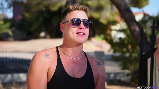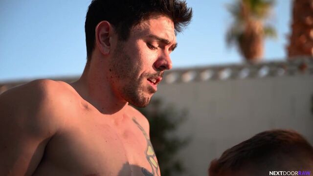 Nico Coopa is heading out to lay by the pool when Logan Aarons knocks on the door, returning a package delivered by mistake. There's immediate chemistry, and Nico invites Logan to join him by the pool. The guys can't take their eyes off of each other sunbathing and their wandering eyes quickly turn into wandering hands. The guys keep their mouths and holes busy in this sweaty poolside flip-fuck.