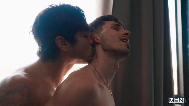 Ashton Summers is passing the open bedroom door when he notices Kane Fox stretched out on the bed, naked and in the throes of pleasure as he strokes himself. Kane notices the sexy top watching and beckons him to join him, and the guys kiss before Kane sucks Ashton. Light and shadow play over their bodies as Ashton fucks the bottom against the window frame, then Kane straddles Ashton on the bed, frotting before sitting on the top's cock. Ashton fucks the horny bottom in doggystyle and on his back until Kane orgasms, then pulls out and cums.