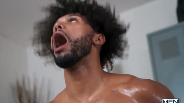 Joey Mills and Tony Genius's big packages bounce in their gray sweats as they stretch and do their workout. The guys get changed in the locker room, and Tony checks out Joey's ass in his jock strap and starts touching it. Joey sucks the top, and Tony tongues Joey's hole, then eases his cock inside before the bottom rides him on the bench. The top flips Joey onto his back, then fucks him in piledriver till the bottom cums, and Tony finishes with a creampie.