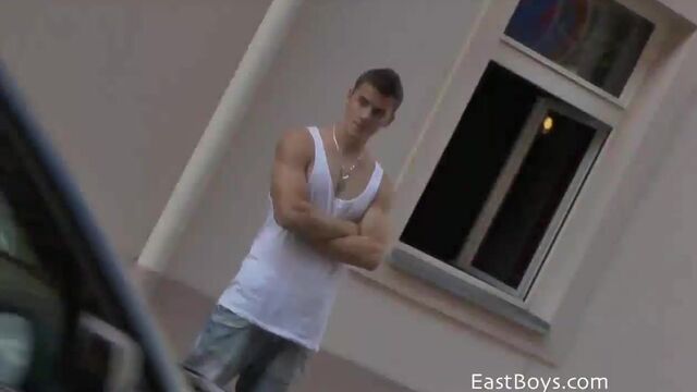 Muscle boy Ronnie getting handjob in a limo culminating with spectacular cumshot, is what you will see in this video. In traffic and full nude, in a car and also parking lot!