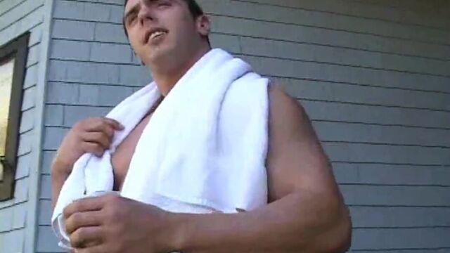 Wow. Have you seen this guy's muscles? He's huge.We'd be talking about Stewart, our newest addition to NextDoorMale. At only 23, he's almost got the body of Arnold...but he's much sexier than that.Stewart got talked into doing porn for a bit by his girlfriend, Lisa, who he's been dating for over 2 years. This one's taken, but that doesn't stop us from offering him all sorts of work on our other sites. So far he seems pretty open minded, luckily for us...and you.Stewart decides to start touching himself while lying in his bed. The hulk of a man undresses and continues the teasing of his cock. Stewart then gets off the bed and walks outside where he takes a seat on the steps, and begins stroking himself again. When he wants to cum, he wonders around the house to the back yard, where he lubes himself up with massage oil before bringing himself to climax, which leaves his ripped abs covered in his thick, warm cum. Enjoy!