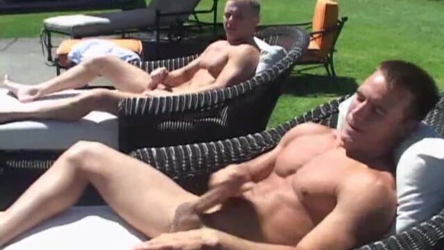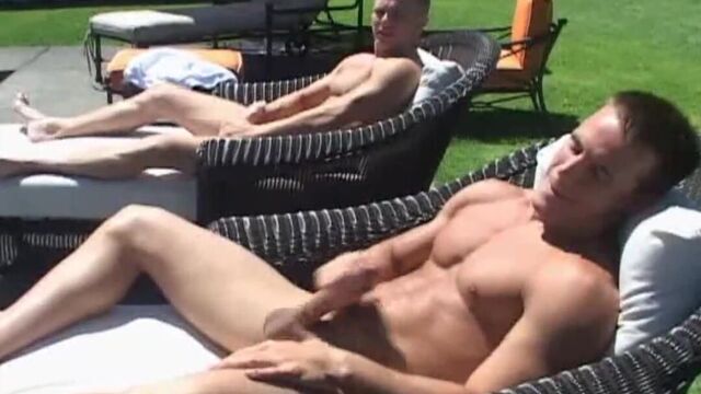 Tommy was headed toward the pool the other day when he spotted Marcus, his 23 year old studly friend swimming nude. As Tommy hid himself in the shade of a nearby gazebo, Marcus sat himself down in the sun on a lounge chair and began to play with his big, uncut cock. This of course, turned Tommy on enough to get him to start rubbing himself as well. Once Marcus spots Tommy hiding in the shade jerking off, he invites his buddy to come over and join him.This scene features two hotties stroking their rock hard cock until they blow their loads all over themselves. Enjoy these two as they have fun in the sun!