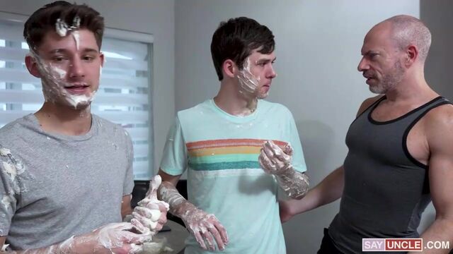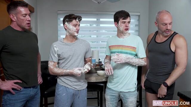 Dakota and Dex are stuck with the lamest home ec assignment, and they are having trouble focusing. They need to bake a cake for their class, but it’s much more fun to tease each other and make a mess in the kitchen. Their stepdads, Bruce and Cole, overhear some nice from the kitchen, so they decide to see what’s going on. When they arrive, they are shocked to find the whole room and even their own stepsons covered with cake batter. Mad, the two stepfathers put their collective foot down: the mess needs to be cleaned up somehow! Yet, everything looks so delicious, so why don’t they clean their boys’ mess with their own tongues, right?