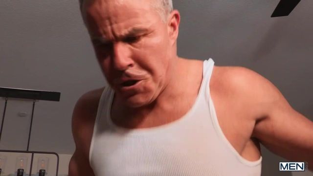When silver fox Ron's (Dale Savage) overnight house guest arrives while the A/C is out, he tells the nerdy, young man to slip out of his duds and get comfortable. IT guy Greg (Nate Grimes) is a bit shy to strip in front of the older man at first, but before long the guys have their dicks out and are challenging each other to a sword fight! Nate sucks Ron's cock and Ron fingers Nate's hole while swallowing the twink's boner, then fucks Greg missionary before telling the younger man it's his turn to top him. Greg does a great job of pounding Ron's hole till the DILF cums, then feeding Ron his load.