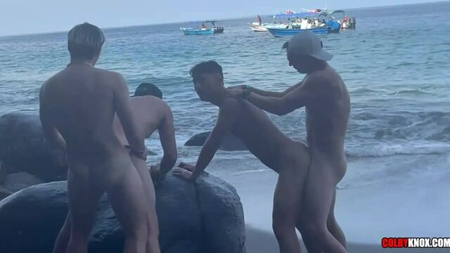 - Description: We share more Puerto Vallarta merriment this week! Husbands Mickey Knox and Colby Chambers return to filming on the beach rocks. They are joined by stud Max Star, looking real sexy in Speedos. A naked Colby immediately tells Max his intentions. “I just want to play with your gorgeous, fucking ass,” Colby explains. He and Max kiss (Mickey is the cameraman at the start of this video). The swimming gear is removed and Max kneels down to swallow Colby’s cock. That warm mouth is fucked; Colby’s balls strike Max’s chin. “No gag muscles,” Colby observes. He wants a space a little tighter so he gets behind Max, licking the boy’s “third eye.” As his tongue gets that hole wet, Colby tugs Max’s meat. When Colby stands up Max knows what’s next. He hands him some lube and takes a poppers hit. After some teasing, Colby works himself inside Max’s butt. Colby pounds and the strokes are powerful; Max takes each thrust. “Your dick feels so good,” he whispers. “I want to milk you all the time.” Colby picks up the speed. Max looks back with a smile on his face. “Use me,” he begs. “Destroy that hole.” Never offer Colby a challenge like that because he will always take it. :-) There’s a position change and Max gets on his hands and knees. “You got that lube, baby,” Colby wonders. Cameraman Mickey hands it over and Colby returns to plugging that phat ass. The trio move to the beach. Colby and Max play with Mickey’s ass. Trotting on scene is Danny Ice. The nude stud, with sunglasses, starts to suck Colby’s cock. Mickey and Max swap spit. Mickey hits his knees, sucking Max off. Colby treats Danny like he treated Max, fucking his face. As for the other pair Mickey leans against a rock, offering his butt for Max’s pleasure. He saddles up, stuffing Mickey’s hole. Danny leans on the rock, following Mickey. Colby, at first, bends down and eats Danny out. Then he hammers. Max does the same to Mickey. The bottom boys handle each stroke. Colby uses Danny’s head for leverage. Max grabs Mickey’s hips. “Fuck me,” Danny whimpers. It turns into a contest of who will bust first. Colby wins, breeding Danny with a load of cum. When he eventually pulls out he smacks Danny’s butt cheek and gives him a kiss. Max nuts next, shooting his seed deep inside Mickey. “You’re so thick,” Mickey says to Max, after the cutie pulls out of the man milk soaked hole. “I love it.”
