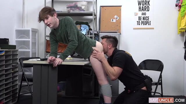 Nicholas, a young twink with a defiant attitude, sneaks into the mall security office and finds Jordan, the hot security guard, jerking off. Curious and aroused, he tries to enjoy the show from a distance, but he is just too obvious, interrupting Jordan’s solo session. Pissed, the security guard detains him, frisks him, and makes him remove his clothes for inspection. In an attempt to both avoid trouble and get what he really wants, Nicholas agrees to play nice with the officer’s dick and get fucked to make the situation go away.