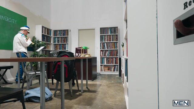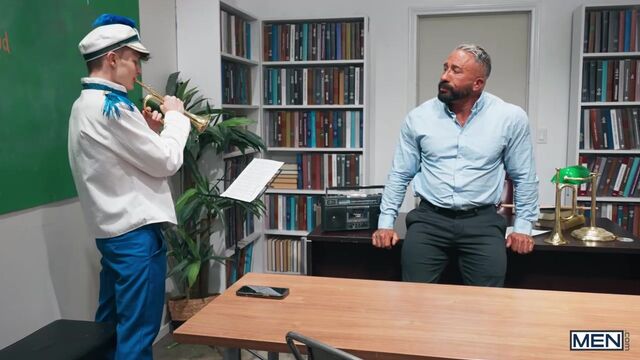 Marching band geek Jake Preston is nervous for his meeting with the band teacher after he blew his solo, so he calms down with some joke selfies, like pretending he's fucking his trumpet. One thing leads to another, and professor Ken Rock comes in to find Jake with his hard dick in his hand! Ken tells Jake to put it away and play for him, but Jake can't concentrate when the professor bends over. Ken goes into the storage room and sticks his cock through a hole in the wall, and Jake eagerly blows it, then gets sucked by his teacher! Jake licks Mr. Rock's hole and penetrates him over his desk, then fucks his throat before drilling him on his back and in spoon. Ken cums as the band geek fucks him from behind, then takes a facial.