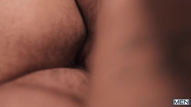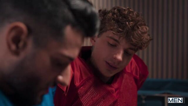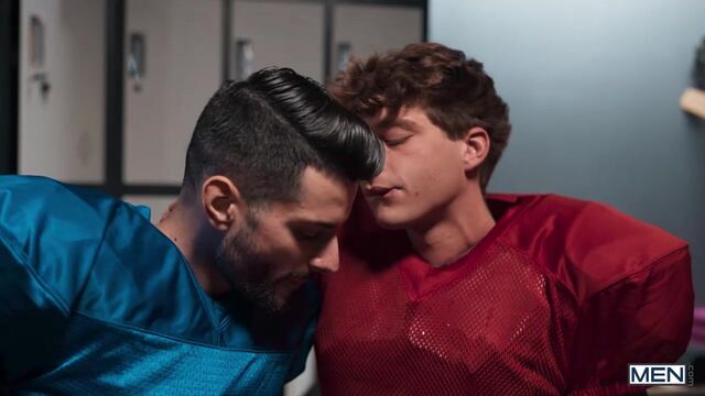 Samm Fitness is dejected after the loss on the field, but rival QB Leo Levine comes to the locker room to offer some consolation. Samm flirts, checking out Leo's bulge, and Leo asks if he can join Samm in the showers. The guys are on the same team as they kiss and Samm sucks the top before they jack each other's dicks, then Leo bends Samm over to fuck him. The top drills the handsome bottom on the bench, and Samm rides Leo until he cums, then takes his load on his hairy chest.