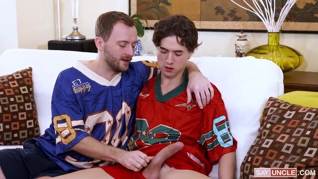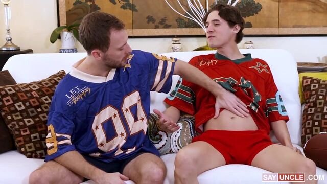 My stepdad thinks he's an expert at everything. Today, for example, we were bonding, watching a football game, and he kept saying that one of the players was too skinny for a safety. Then he kept bragging about how he used to play safety in college, so he had a thicker build. Of course, he had to take the opportunity to show off his muscles, and he was right. I never noticed how big and strong his arms were. Was he... hot? Was his dick as big as his muscles? I was really nervous when he asked to see my abs, but he liked them. In fact, he liked them a little bit too much. So much so that before I even noticed it, we were both naked, and his fat cock was throbbing inside my ass. I don't know if he really knows as much about football as he says, but let me tell you, he's an expert at fucking! I'm glad I had him teach me how to make a man cum. Our team wasn't the only one that scored that day.