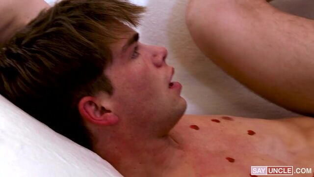 It’s Valentine’s Day, and nobody has asked Oliver out. The poor twink feels bummed and left out, so Oz, his loving stepdad, tries to make him better by recruiting his help for decorating the place to surprise Oliver’s mom. The two enjoy a nice bonding moment together, but even after joking around and finishing with the decorations, Oz notices Oliver still feels excluded. Determined to boost his self-esteem, Oz goofs around by decorating Oliver’s smooth chest as a joke. One thing leads to another, and soon, they are both making out passionately. The tender bonding moment becomes a raw fuck as Oz pounds Oliver’s tight asshole on the couch before mom gets home.