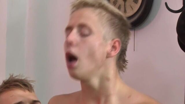 Chris is up late, enjoying his own hard cock in a wank before bed when his friend Justin arrives and discovers that stiff dick! He can't say no to an opportunity like that and within moments the two friends are wanking and sucking those shafts. Things get hornier when some ass is offered, with Justin sliding his pucker down on his friend's naked cock and taking it for a ride. The lust for fucking is definitely reciprocal, as you'll see when the boys swap and Justin sinks his length into Chris and makes him cum, finishing off with his own load wanked out in the boy's face!