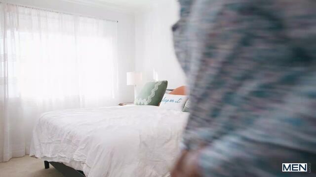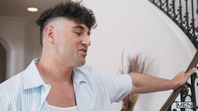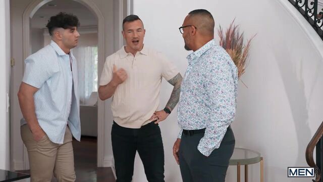 Realtor Dillon Diaz is giving himself a pep talk to make his first sale before his clients arrive to see the house, but he spills coffee on his shirt! As he's cleaning up, husbands Derek Kage and Michael Boston let themselves in and catch the agent with his top off. Derek and Michael both want him, and when Derek goes to the bathroom, Michael offers Dillon a sneaky beej! Dillon sucks Michael too, and one taste of dick isn't enough, so he offers his ass to Derek in the bedroom. Dillon's tight hole eagerly takes that dick, but Derek hides when his husband comes in! Michael 69s the realtor and cums on his face, and Derek comes back to teach Dillon how to ride dick and gives him another facial.