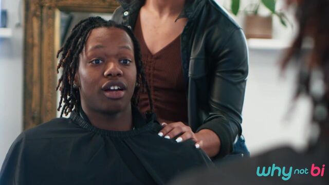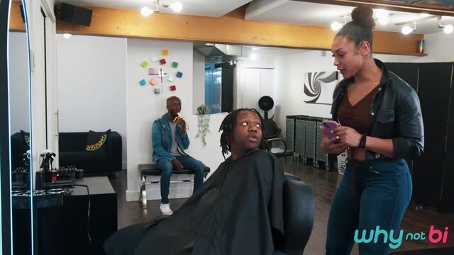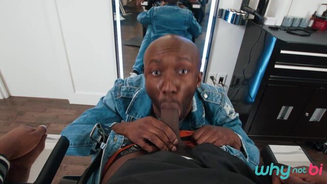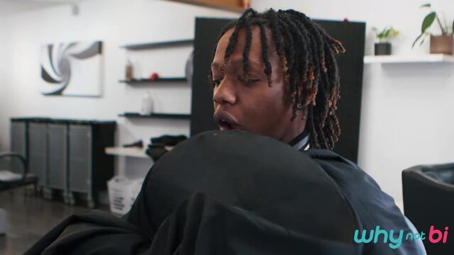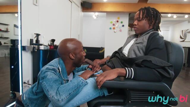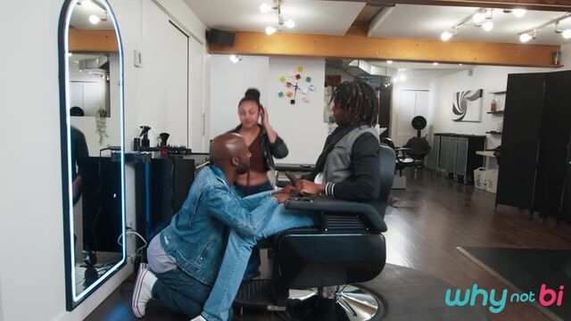 Shawn Rhimes doesn't have an appointment, but stylist Naomie Stark says she can fit him in after her next client. Shawn's eyes widen as hottie Jade Desir walks in, and when Naomie leaves to take a call, Shawn makes his move and sucks Jade's cock! He hides under the cape when Naomie returns, but she quickly unmasks the truth. Jade assures her he's bi, so she joins in on the BJ, then sucks Shawn as Jade fucks her. Next it's Shawn's turn to take Jade's dick, and Naomie and Shawn share Jade's huge load.