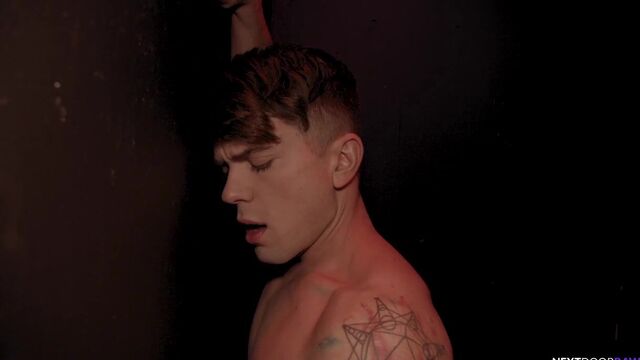 Elliot Finn experiences his first ever glory hole as he sucks and fucks Dakota Payne's large rod through a wall. After some deep throating and hard ass stretching through the hole they switch to some face to face sex and both cum all over Elliot's stomach.