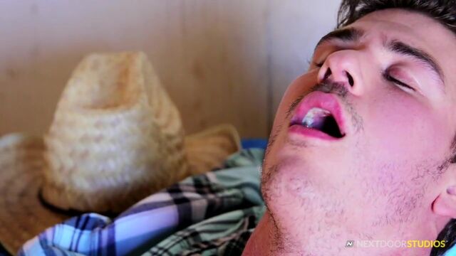 Elijah James is out on the farm doing his daily chores but today he's been having a harder day than usual so as he set out to do his chores he thought he would spice it up. He finds a nice secluded spot on the farm and makes himself comfortable up against some hay bails. He slowly starts to undress revealing his fit formed body. He slowly lets his hands wander all over his ripped chest and nipples. He makes his way down to his zipper and pulls out his hard cock and begins stroking it. As his dick becomes harder and harder he pulls on it faster and fast sliding his manly hands up and down his throbbing shaft. Elijah continues to stroke his sexy hard dick until his balls are finally ready to release his built up farmer load. He shoots a warm load all over his chest and back to work he goes.