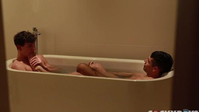 Are a Cancer and an Aries compatible? Küper & Ty Mitchell make the case for it in a condom-free scene that takes you sensuous to wildly hot & sweaty sex. The guys get to know each other in a warm bath in which Küper can't get enough of sucking Ty's toes. In return Ty plays footsie with Küper's cock before they make out extensively, only stopping so Ty can suck Küper's big dick.