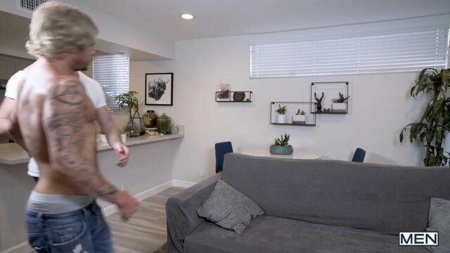 Tall, lean Pierce Paris has a leaky sink to fix and who better to get the job done than sexy, chiseled Blake Ryder. Athletic Pierce accidentally gets the blond-haired hunk wet when he turns on the water so he offers to dry his shirt, but not before making out and getting his big, thick dick sucked! Tattooed Blake still has a while to go before his shirt is dry so he makes use of the time and fucks Pierce’s tight hole until they both cum.