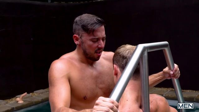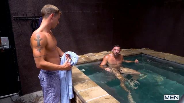 Dark-haired Shane Jackson is taking a dip in the hot tub and he brought his trusty dildo with him. Chiseled stud Justin Matthews comes along, and he’s shocked when he realizes that hunky Shane is actually riding the dildo inside the tub. Blond-haired Justin is secretly turned on and decides he might as well just give him the real thing. He continues widening Shane’s ass with the dildo before inserting his own huge meat inside his horny, tight hole.