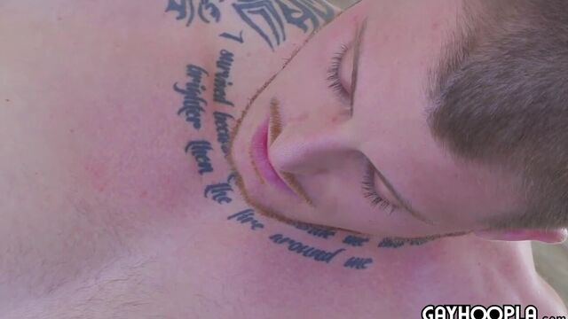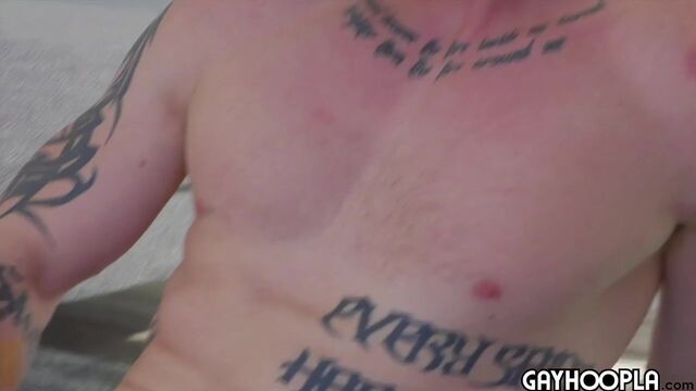 He did a great job in his first scene.. RIGHT up to the end. And then... he was a bit nervous. He'd never cum in front of a guy before. So he asked for a bit of "alone time" to help him get there and then... POW... he came without giving us enough warning so.... we didn't get it on camera. Oh well... he at least had the cum there on his tattooed abs.