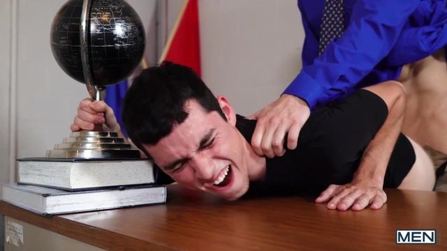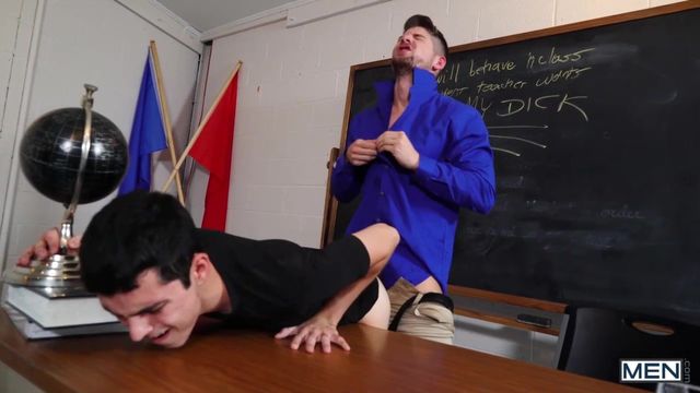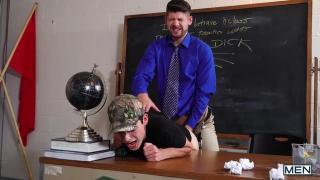 Blue-eyed Connor Halstead has had enough with the students in his detention class, and he’s fed up with dark-haired troublemaker, Xavier Ryan, whose lean bottom is just right for the kind of punishment muscular Connor has in mind. He bends the tall cutie over his desk and shoves his big dick inside his hole as deep as he can get it until he busts a nut all over Xavier’s face.