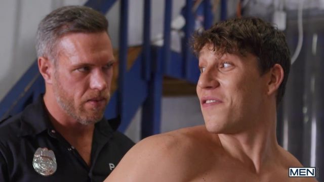 Officer Alex Mecum and his partner are staking out the local supermarket to catch the bandit known only as The Thief of All Dick-Shaped Things. When Alex spots suspicious trenchcoat-clad Paul Canon fingering the phallic produce and pocketing a zucchini while making flirty eye contact, it's clear this bandit wants to get caught. Alex places Paul under arrest, and his suspect demands a pat-down! Alex finds plenty of dick-shaped things before his hands close on Paul's dick, and the perp asks the officer to fuck his face. Alex enjoys the blowjob, then eats Paul's ass and penetrates that tight hole doggystyle. Paul rides that cock and then demands a facial that friendly Officer Mecum is happy to provide.