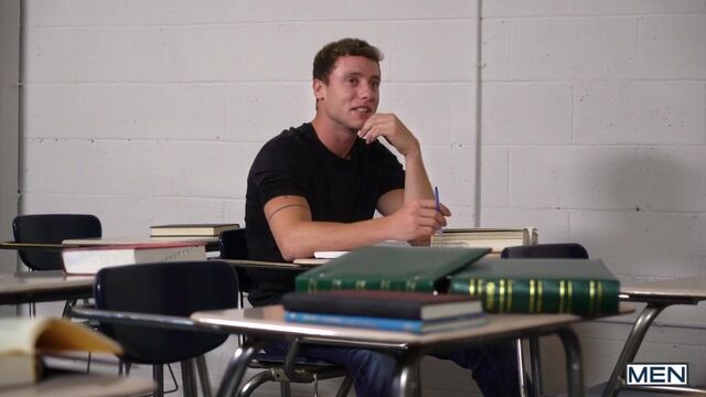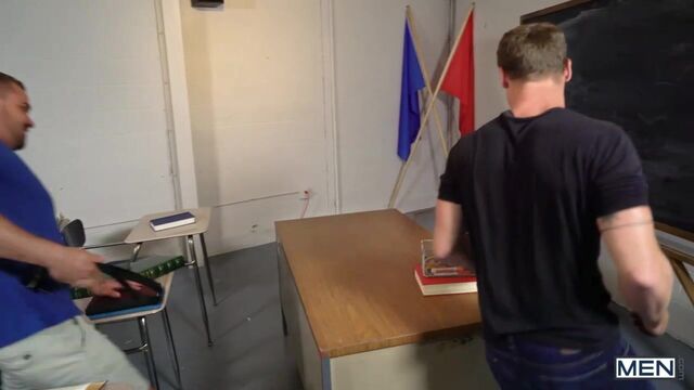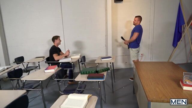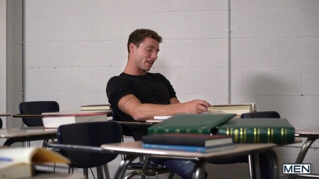 Beefy Darin Silvers and athletic Justin Matthews are sitting in class quietly working on homework. They break the silence to talk and brown-haired Justin explains what he did to get in trouble. Tattooed stud Darin is shocked that all he got was detention so he grabs ahold of Justin bends him over the teacher’s desk and spanks his ass. Darin tells him he’s giving him the punishment he deserves and Justin likes it so much that he asks him to do it again.