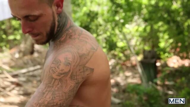 Bearded hunk Steven Roman is trying to get his heavily tattooed informant, Brian Michaels, to give up some information for his investigation. Tall, blue-eyed Brian agrees to help if he can get a blowjob in return. Beefy Steve accepts the terms and gets right into it sucking and slobbering on Brian’s big dick. Brian isn’t completely satisfied until he’s rimming Steve’s big, muscular, bubble butt and digging his ass out as deep as he can. Will Brian actually give up the info?