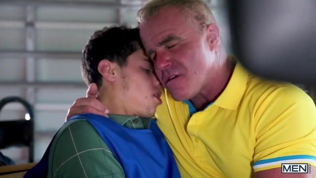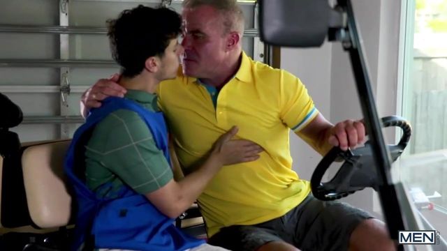 When Kaleb Stryker is hired as a caddy for the local country club, he's thrilled when silver fox owner Dale Savage takes him on as his personal caddy, because he gets to spend all day watching and fantasizing about the hot daddy. With a little encouragement and some oddly specific tips from Dale's daughter, Kaleb asks for some pointers on his swing and is soon getting spooned by the hot golfer. They hop in the cart and head back to the garage for some privacy so Kaleb can suck Dale's cock and the mature hunk eats the twink's ass so good it's like a hole in one. Dale spanks that lush booty, then tees up to fuck it hard before Kaleb gets on top to ride him like a golf cart. Dale drives his cock hard into Kaleb's hole till the hot teen cums, and Dale pulls out to make his own shot.