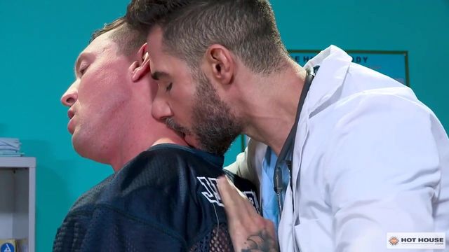 Pierce Paris has a sore shoulder from practice and is waiting to be checked out on the exam table. When nurse Dean Monroe gets a look at Pierce, he puts on a white lab coat and pretends to be the doctor. Dean isn't going to let this stud get away, and after massaging Pierce's shoulders, he can tell that Pierce is receptive to his advances. Dean can see that Pierce's bulge is growing by the second and he reacts quickly by getting the hunk out of his pants. Dean takes Pierce's massive dick in his mouth, and as Pierce continues to disrobe, Dean takes full advantage by sniffing and licking every article of clothing that Pierce throws to the floor. Soon the ripped studs are fully naked and Pierce knows exactly what his new 'doctor' needs. Pierce takes Dean's uncut cock and balls in his mouth and then flips him over to lick his tight ass. Pierce wants to feel Dean from the inside and slides his monster cock deep into his hole. It's exactly what Dean needed and after flipping around to take Pierce's cock in as many positions as he can, he blasts a load in Pierce's hand that feeds it back to Dean. Pierce has worked himself to the brink and needs to bust a nut. He throws Dean down onto the table and straddles the stud until his cock explodes into Dean's open mouth. This is just what the doctor ordered...if only Dean were really a doctor.