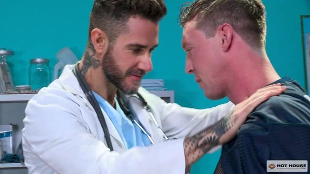- Description: Pierce Paris has a sore shoulder from practice and is waiting to be checked out on the exam table. When nurse Dean Monroe gets a look at Pierce, he puts on a white lab coat and pretends to be the doctor. Dean isn't going to let this stud get away, and after massaging Pierce's shoulders, he can tell that Pierce is receptive to his advances. Dean can see that Pierce's bulge is growing by the second and he reacts quickly by getting the hunk out of his pants. Dean takes Pierce's massive dick in his mouth, and as Pierce continues to disrobe, Dean takes full advantage by sniffing and licking every article of clothing that Pierce throws to the floor. Soon the ripped studs are fully naked and Pierce knows exactly what his new 'doctor' needs. Pierce takes Dean's uncut cock and balls in his mouth and then flips him over to lick his tight ass. Pierce wants to feel Dean from the inside and slides his monster cock deep into his hole. It's exactly what Dean needed and after flipping around to take Pierce's cock in as many positions as he can, he blasts a load in Pierce's hand that feeds it back to Dean. Pierce has worked himself to the brink and needs to bust a nut. He throws Dean down onto the table and straddles the stud until his cock explodes into Dean's open mouth. This is just what the doctor ordered...if only Dean were really a doctor.