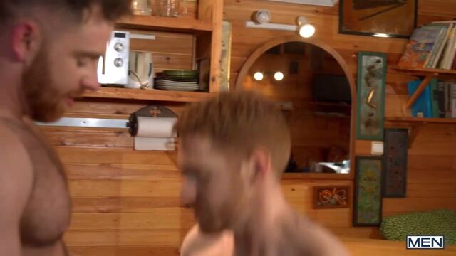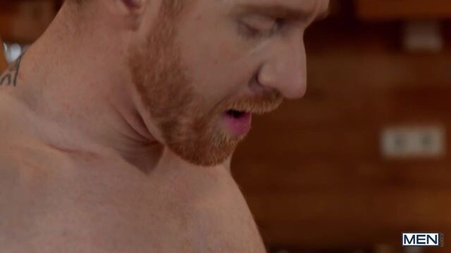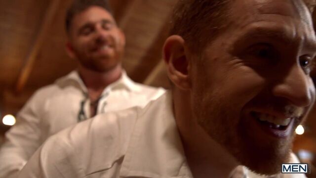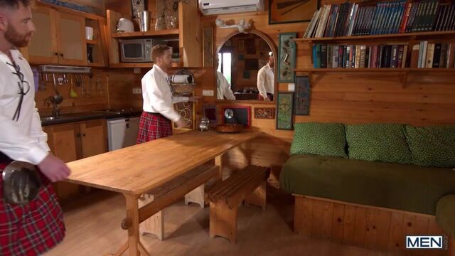 It's a real bachelor's weekend in Scotland, and these guys are suiting up in their kilts and sporrans for the ultimate stag party. As everyone knows, the proper way to wear a kilt is with nothing underneath, so when Jonas Jackson gets up on a chair to check if the light bulbs are burned out, Leander has a perfect view of his cock and balls, and pretty soon Leander's kilt is lifting from his boner! When Leander gets on his knees to turn on the water valve, his kilt rides up and it's Jonas's turn to admire Leander's ass and his tight hole, then to fuck the bottom doggystyle and eat his ass. The kilt-wearing Brits swap blowjobs and Jonas fucks Leander's ass till he cums, then covers his face in spunk.