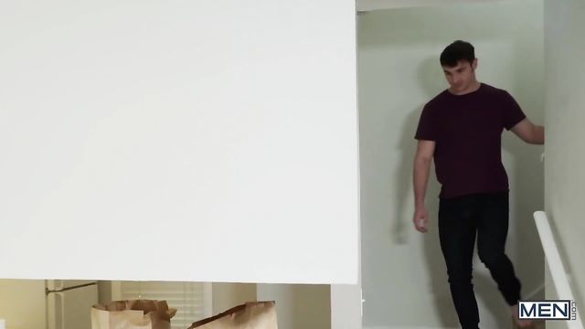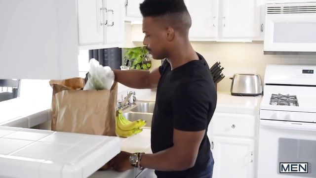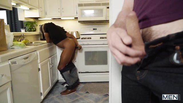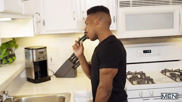 Fit cutie Adrian Hart is just trying to be helpful, offering to carry in some groceries for a woman in need. When he gets into the woman's house and meets her son, the athletic brown-eyed Michael Boston, he gets so uncontrollably horny that he starts masturbating with a cucumber. Michael spies on him, jerking his big curved cock while watching from around the corner! It's not long before these two horny dudes can't resist any longer and start fucking rught there in the kitchen, which Michael's mother is... not thrilled about.