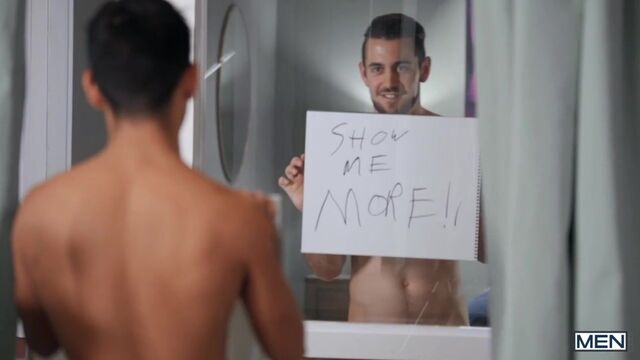 Dante Colle enjoyed the show his new neighbor Ty Mitchell put on with his man, and he wants more. The guys flirt via written signs, and Dante watches as Ty sticks a big dildo to his window and stretches his ass with it. Dante invites Ty over for a little more fun, and soon Ty enters his gaybor's bedroom to suck Dante's cock. The horny bottom deepthroats that dick, then rides it reverse, and Dante flips Ty over to fuck him in missionary. Dante eats Ty's ass, then fucks him doggystyle... which is when Ty's hubby Reese Rideout spots them through the window. Reese is upset to see Dante put his husband up against the window and fuck him doggystyle, storming out before Ty cums on the glass. The bottom doesn't spare a thought for his man as he takes Dante's big load on his face.