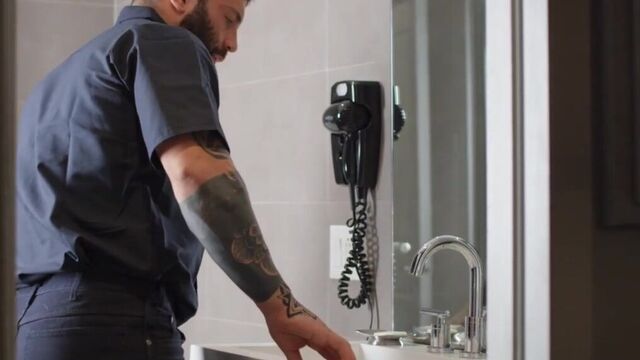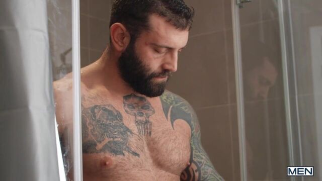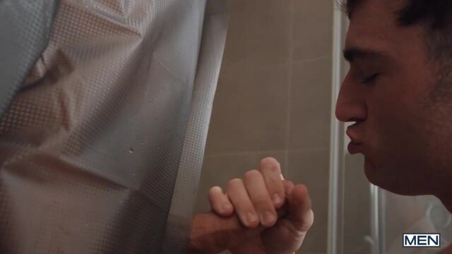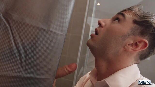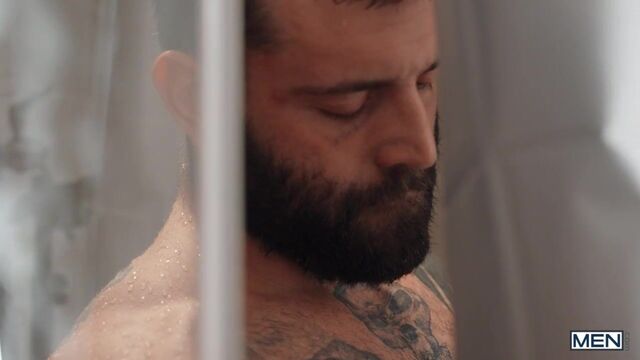 Michael Boston would actually like to be able to shower when he gets home, so he tells his boyfriend, Thyle Knoxx, to call a professional instead of trying to fix the pipes himself. Handsome bearded plumber, Markus Kage, cums to the rescue, but after he fixes things, he gets so dirty he needs to hop in the shower. That's when Michael gets home and reaches behind the curtain to jack off and suck the dick he thinks belongs to his man. Markus fucks Michael doggystyle, and the guys sneak into the kitchen where Michael does a standing split as the hot plumber pounds his ass. He rides Markus's pipe before getting fucked mish till he cums. Markus finishes the bottom off with a creampie!