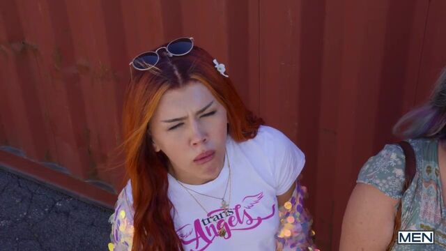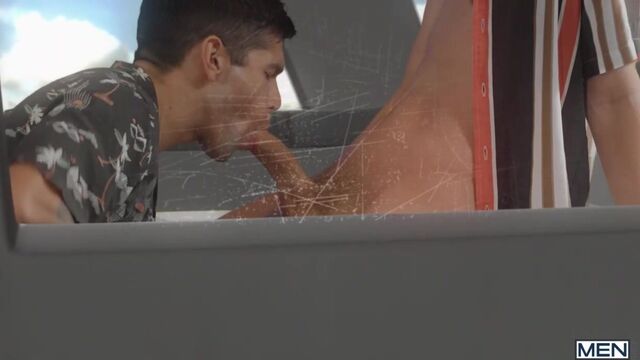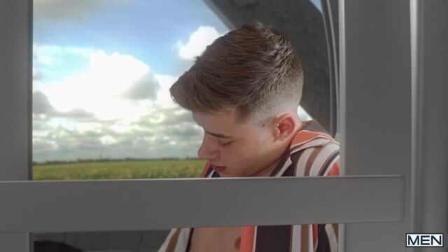 It's a hot day at the carnival, and after some flirting with intent in the line for the ride, Joey Mills and Ty Mitchell decide to get freaky on the Ferris wheel! The crowd spots Ty sucking Joey's cock as the big wheel goes around and around, and sexy ebony police officer DeAngelo Jackson is waiting for the two naughty twinks when the music stops. DeAngelo starts getting turned on when he watches the video Joey recorded, so Ty hops up on the desk and soon Officer Jackson is eating his ass while he sucks Joey's dick. Both twinks get fucked by that big black cock, then Joey and DeAngelo take turns pounding Ty's ass till the bottom cums on the one-way glass and licks it up, before they both give Ty a big facial.