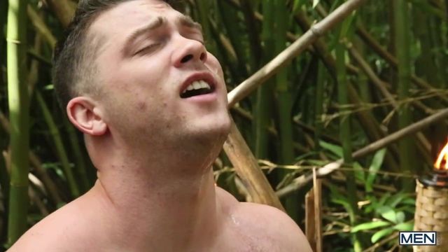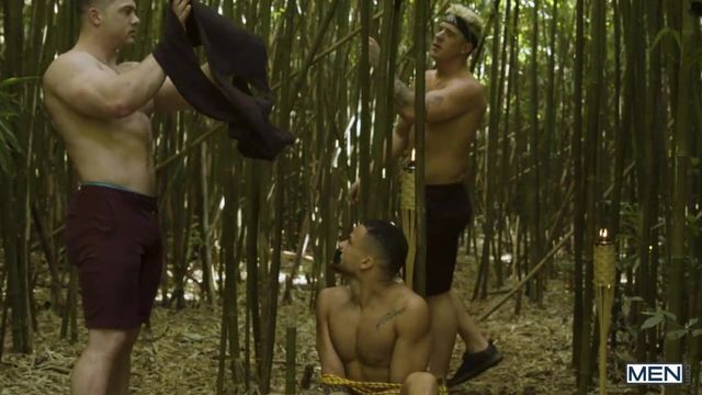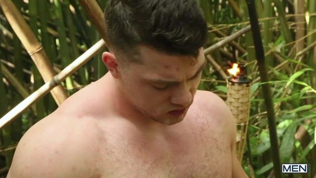 After learning that Beaux Banks was at the scene of his friends' mysterious demise, angry meathead Collin Simpson vows to take revenge, and his buddy JJ Knight knows just where to find him. The guys turn up with torches just as Beaux is trying to explain to Matthew Camp and his friend Colby Tucker that he's innocent. Collin and JJ chase Beaux through the forest, cornering the siren and tying him up. To celebrate their victory, Collin sucks JJ's cock and the guys 69 before Collin eases his ass down on JJ's thick cock. JJ gives Collin's ass the deepest pounding ever before cumming on the bottom's face, then sucks Collin's cock and takes a facial of his own... just in time for them to see Beaux escaping!