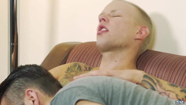Brett Lake is finally on leave and he heads over to Dante Colle’s place so he can crash for a few days. He is more than welcomed by the athletic, military hunk who invites him in and offers him a hot shower. Brett is so horny that the blue-eyed stud whips out his wall dildo and gets to work on his ass. A curious Dante can hear him moaning and decides to check it out. He slowly enters the bathroom and is more than pleased to find him in prime position! He wastes no time offering up the real thing.