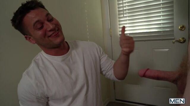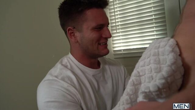 Allen Lucas is watching his new hire, stud muffin Justin Matthews, mow the lawn with his chiseled, bare chest out. The horny hottie recruits his friends to help him pull a prank on Justin so he can get him in the buff. They douse him with water, forcing him to run inside naked, where Allen is conveniently waiting with a towel to help him dry off. Justin is really turned on and accepts a blow job from Allen, priming his dick to fuck some boy pussy for the first time before getting fucked himself!