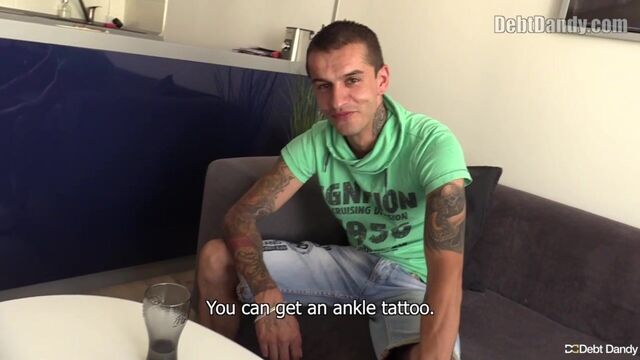 - Description: I met people who were very passionate about their tattoos before but this guy was somehow extreme. The only reason why he wanted to borrow money was his new tattoo. He was on the waiting list of his favorite tattoo artist for months. Then suddenly the artist offered him to do the tattoo the next day. Our boy didn´t hesitate and agreed. Originally, he planned to save money for the piece and now he needed it today. He asked me for 15 000 Crowns. Too bad the guy had some naive ideas about repaying the loan. That´s why I offered him a more painful but a lot quicker way to get the money. He didn´t like it but I wasn´t going to let him go now. Not after he told me that he liked to work-out. I wanted to see his tattooed and firm body. I wanted to see him cum.