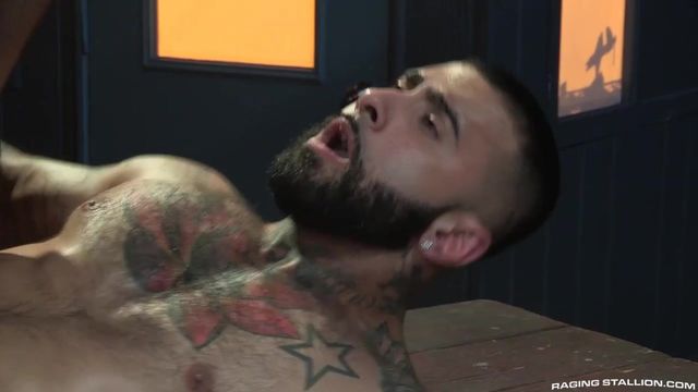 Rikk York is smoking a cigarette next to a barrel fire in a seedy alleyway. He isn't wearing anything but a leather vest and big black boots. Dirty muscle daddy, Manuel Skye, approaches the hung stud and rubs his cock through his jockstrap as he gives Rikk a peek at his giant, meaty sack. The two muscled up hunks start making out and rubbing beards until Rikk squats down and takes Manuel's big boner down his open throat. Manuel's low hanging balls swing between his legs as he face fucks Rikk's greedy mouth. Rikk needs his hairy asshole serviced and spreads his cheeks to let the daddy get all the way into the pink with his fingers and long, experienced tongue. Leaning back, Manuel savors Rikk sitting on his throbbing pole. Manuel takes over and pounds the stud's hairy bubble butt, stretching him to the limits. Rikk bounces and grunts as every last inch of the monster cock goes in and out of his tight body. Spreading his legs as far as they'll go, Rikk lies back as Manuel stands above him and keeps a relentless steady pace of thrusting his pelvis deep into the hairy hunk. After all the ass reaming, the guys jack their cocks together. Manuel is the first to let loose and shoots a whooper of a load that hits his own face and sticks in Rikk's big, black beard. They kiss and share Manuel's load as Rikk's dick oozes thick, white cum into his hand and all over his fuzzy crotch. Manuel rubs the sticky jizz into Rikk's hairy chest and they continue kissing and swapping cum as they rub their drenched bodies together.