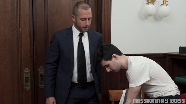 President Lewis is experienced in introducing young men to the more unexpected and intimate parts of their mission.He knowswhat a shock it can be for the innocent elders to learn the delicious secrets of priesthood sex, and he eases them into physical contact by guiding them with his firm, deep voice. Any direction he gives is inevitably met with obedience, even if it the boy is reluctant at first.In the case of fresh-faced Elder Hult, he finds the older man to be irresistible. He is nervous to meet with him privately, afraid that he will give up his hidden attraction to the man with his eyes or a quiver of his voice. He stays quiet and casts his eyes down down in an attempt to conceal his dark desires and keep them contained within his yearning soul and body. But President Lewis can’t be duped – he’s too experienced and too hungry for the young boy’s flesh. He sees right through Elder Hult’s defenses, and he wants to calm the boy’s mind. He calls the young man over to sit on his lap, and holds him firmly by the arm while gazing into his anxious eyes.“I think you’re ready,” he says with a friendly smile, offering a rare crack in the stoicism he usually employs when interacting with the young men of the mission. He takes off the boy’s shirt and tie, and places his warm hand on his bare chest. Elder Hult looks down at the man’s fingers and wonders what they are capable of. Will they be used to hurt him? Is suffering and pain going to be mixed with the love he feels for him? Or will they be used for … something else? Something so tantalizing that the boy can barely bring himself to picture it or fantasize about how would feel.His questions are answered as President Lewis’s hand moves slowly down his torso, descending until it hovers over the young man’s cock. Elder Hult can hardly believe what is happening. It is almost as though his deepest fantasies are pouring out of him, into the air, and becoming reality. He knows that his attraction toward other men is sinful, he has been taught it all his life. But what if that isn’t true? What if, through his devotion to the mission and his obedience to the mission rules, he has earned the right to play out his fantasies with his mission leaders?If there was ever any question whether the boy would be able to conceal his sexual drives from President Lewis, it is now answered. The man lifts the missionary’s undershirt over his head and pulls his underwear down to expose his engorged cock. The President knowingly the boy’s erect dick and is pleased – he’s very well-endowed and clearly full of sexual desire. The other men of The Order will enjoy this one, he thinks as he wraps his fingers around the boys thighs.He lubricates Elder Hult’s smooth hole with his tongue, and the boy is sent into an orgasmic euphoria. The boy wraps his tongue around the head of the older man’s cock, and hopes he’ll be able to please him. President Lewis senses the boy’s eagerness and tension, and tells him to smile as he sucks.As President Lewis grunts and rams Elder Hult’s hole, the boy feels deeply conflicted between what he knows to be right and his sinful desires of the flesh, his lust to be rammed hard and loaded with cum. But what President Lewis is doing to his cock, his hole, his entire body feels perfectly natural and right.