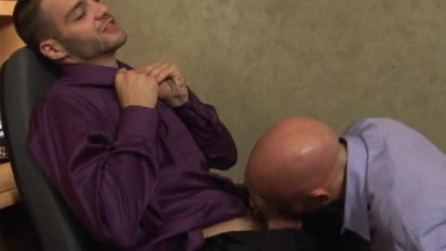 It's another late night at the office for Tommy and he needs a break. He calls up his girlfriend for a little phone sex but in the middle of it walks in his coworker, Drake! Drake notices Tommy is doing more than just work and jumps at his change to help take a load off.