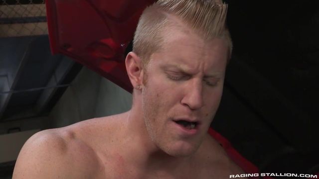 Beefy Italian stallion Johnny V enters the body shop and walks in on Ricky Decker greasing his crankshaft. Johnny's willing to lend more than a helping hand: in this case, his mouth. He gulps down Ricky's thick tool. Ricky rips off his muscle tank, revealing bulging pecs and nipples. Johnny strips off his jeans, exposing his jockstrapped ass for Ricky's mouth to rim. Ricky gives Johnny's ass a lube injection with an oil can from the shop, and then revs up for a full-throttle fucking. They brace themselves against an all-American muscle car, but these grease monkeys are looking for even bigger thrills. Johnny perches on a monster truck tire, which lifts his ass to the level of Ricky's monster cock for a seriously deep dicking. They shift gears when Ricky sits down in a chair, and Johnny lowers himself down onto Ricky's cock for a joyride. Johnny's huge meat swings through the air as he fucks himself on Ricky's dipstick. The full throttle sex culminates as Johnny shoots his load across the shop floor, and Ricky unloads his cum on Johnny's meaty ass cheeks.