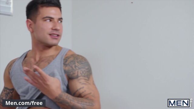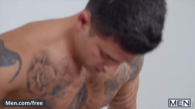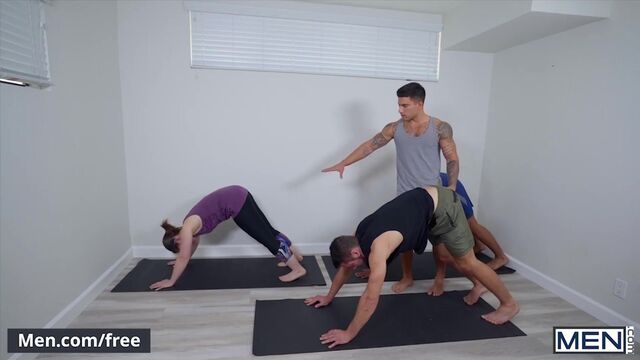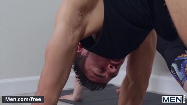 Tattooed, muscular Vadim Black is leading a beginner's yoga class where his newest student is the tall, lean Dante Colle. Vadim runs Dante through a series of increasingly suggestive positions, sneakily rubbing his hard cock against Dante's face and ass. When the rest of the class catches onto Vadim's unconventional approach to teaching they take off in a hurry, leaving Dante and Vadim free to take turns and take their time pleasuring each other's thick cocks in peace.
