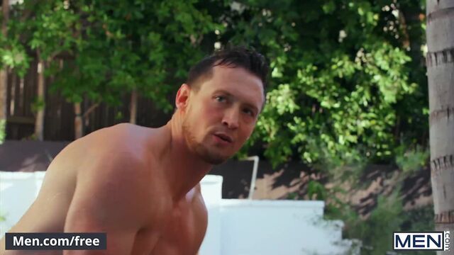 Cute twink Christian Blake could not help noticing tall stud Pierce Paris in the pool. He locks eyes with muscular Pierce, and subliminally invites big dick Pierce to follow him into a private room. Brown-haired Christian props himself up on the bed waiti